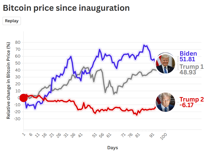 Thậm chí, nhiệm kỳ đầu tiên của Trump – khi ông còn gọi Bitcoin là “trò lừa đảo” – cũng đã ghi nhận mức tăng gần 50% trong 100 ngày đầu, vượt xa hiệu suất của nhiệm kỳ hiện tại.