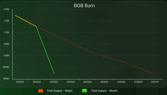 Một bước ngoặt lớn của BGB nằm ở quyết định chuyển 440 triệu token sang Morph Foundation và đốt vĩnh viễn 220 triệu. Động thái này đưa đường cong giảm phát tiến nhanh hơn gần hai năm so với kế hoạch ban đầu và là tiền đề cho cơ chế burn mới, hoạt động hoàn toàn dựa trên dữ liệu thật của hệ sinh thái Morph.