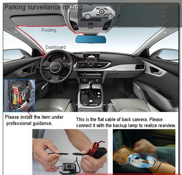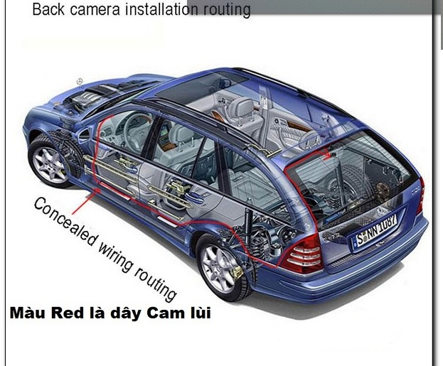 Hình ảnh về việc lắp đặt thiết bị, dây chúng tôi sẽ đi gọn và giấu kín nên quí khách sẽ không nhìn thấy gì hết. Màu đỏ là màu của dây đi ra phía trước và phía sau. Không đụng chạm hay sửa chữa, cắt nối bất cứ thứ gì trên xe. Thời gian thi công có thể đến 1,5h. Sau đó là 5 phút hướng dẫn sử dụng.