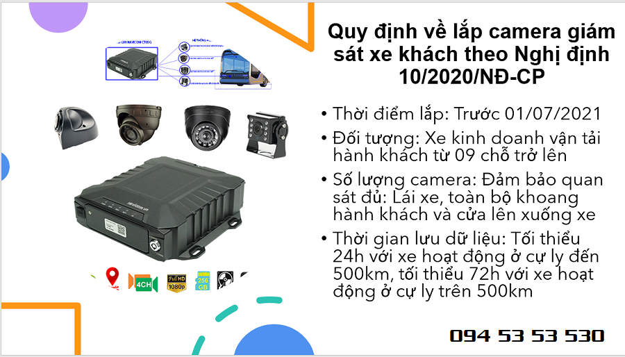 Nghị định 10/2020/NĐ-CP của Chính phủ quy định trước ngày 01/07/2021 xe ô tô kinh doanh vận tải bao gồm xe chở khách từ 9 chỗ trở lên (gồm cả lái xe), xe container, xe đầu kéo phải lắp camera giám sát ( tạm gọi Camera nd 10 hay Camera nghi dinh 10 ) trên xe để ghi hình, lưu trữ hình ảnh trong suốt quá trình xe tham gia giao thông để truyền về máy chủ của doanh nghiệp kinh doanh vận tải và máy chủ của Tổng cục đường bộ Việt Nam theo quy định.