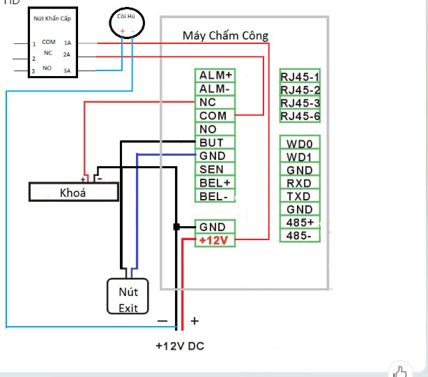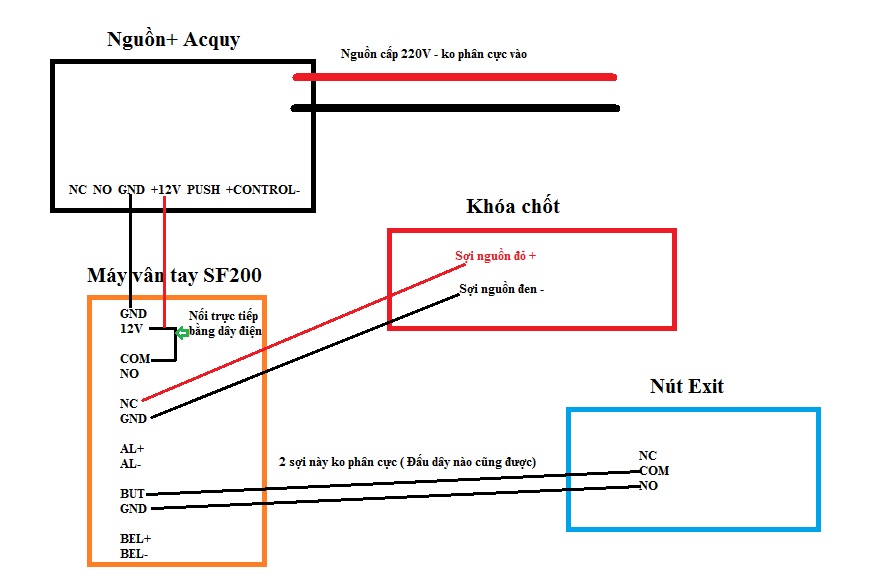 Sơ đồ đấu nối khóa chốt với máy vân tay SF200 kiểm soát sửa ra vào