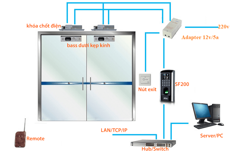 Khóa điện, cảm biến cửa, báo động, nút Exit, Cửa Chuông