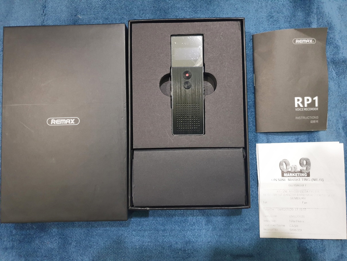 Máy ghi âm Remax RP – 1 trọn bộ sẽ bao gồm 1 máy ghi âm nằm trong khay đựng với chất liệu mút cao cấp, 1 dây cáp để sạc để dẫn truyền từ máy đến với thiết bị ghi âm, 1 tai nghe chuyên dụng theo máy, giấy hướng dẫn của hãng và sách hdsd của hãng.